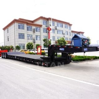 Through the video, you can know different types of 60ton front loading low bed trailer , front loading low load18 wheeler trailer partssemi truck with blowerer , front loading low loader trailer, etc.